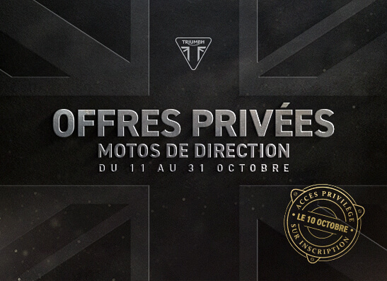 INSCRIVEZ-VOUS pour découvrir les meilleures offres de toutes les concessions Triumph sur un seul et même site, à partir du Vendredi 10 Octobre à 10H.