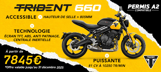 Découvrez les meilleures offres de toutes les concessions Triumph sur un seul et même site, du 11 Octobre au 31 octobre 2025.